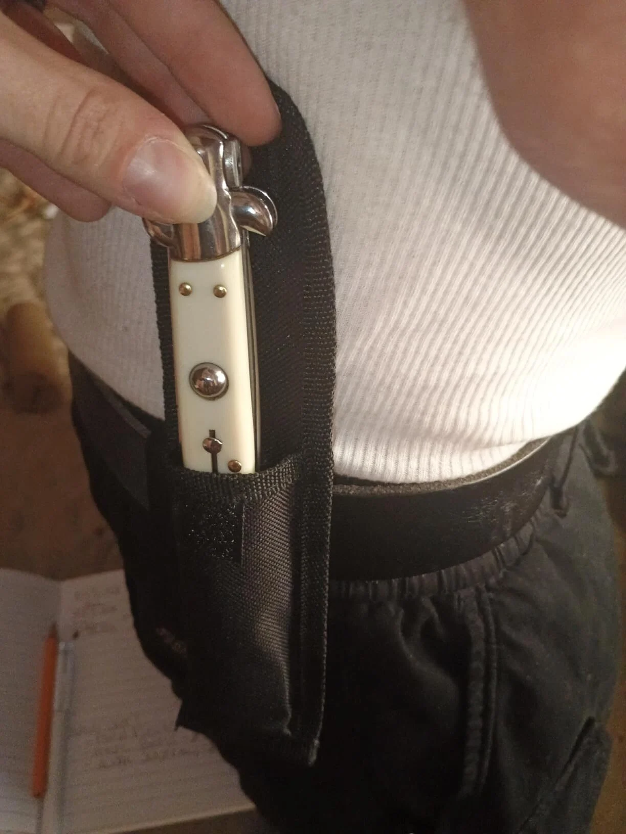 This knife is insanely sharp! The pearl white color looks elegant, and the black version has this nice metallic sheen under light — both are gorgeous. The build feels solid and well-balanced. Even with my small hands, it’s super easy to open (my husband does it in one flick 😂). Shipping took a bit longer than expected, but totally worth the wait. It even comes with a nice fabric sheath that clips right onto your belt. 10/10 recommend! 👍🏼